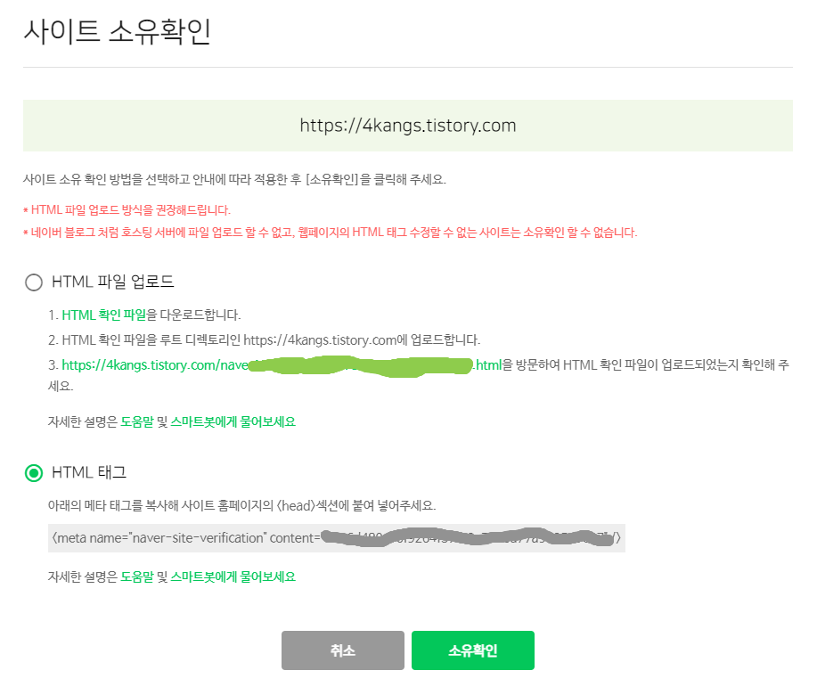 두 가지 방법을 제시하고 있는데요. 아래 HTML태그 입력방식으로 선택해 주세요. 위의 방법은 루트디렉터리에 뭔가 업로드해야 하는데 우리는 루트에 접근할 수 없으니까요.