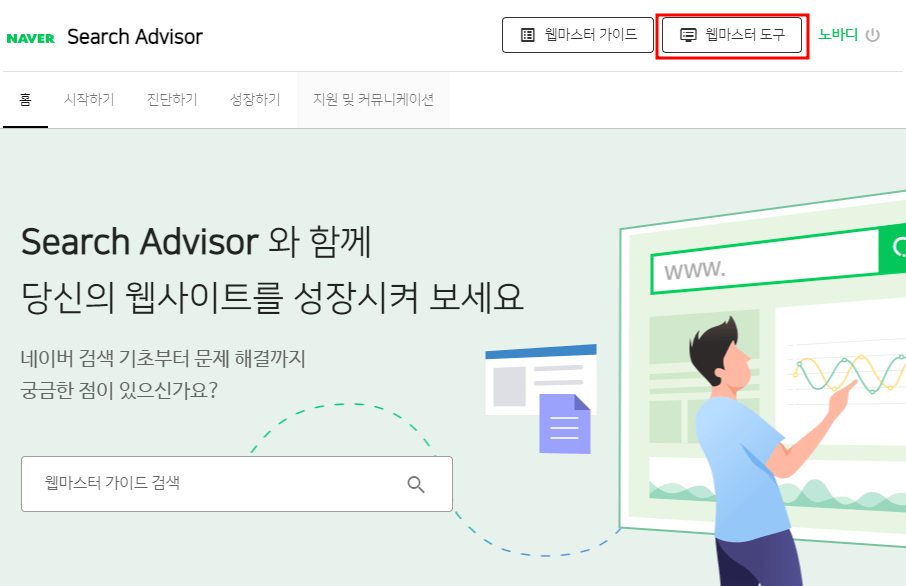 일단 네이버서치어드바이저(https://searchadvisor.naver.com)에 접속하여 네이버에 로그인한 후 우측 상단 웹마스터 도구 버튼을 클릭합니다.