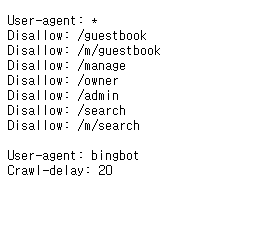 | Disallow | 크롤러들의 접근 제한 범위 명시 |